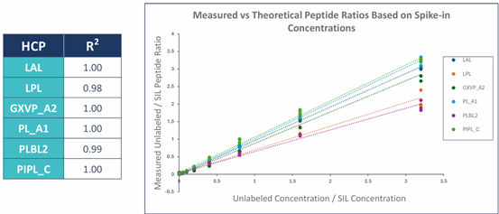 ELISA HCP檢測方法雖能評估總體HCP水平,但無法識別具體種類的脂肪酶,難以對工藝相關風險進行精準評估。為解決這一問題,Cygnus Technologies開發(fā)了基于液相色譜-串聯(lián)質(zhì)譜(LC-MS/MS)的靶向蛋白質(zhì)組學分析方法(CHO 6xLipase? MS Assay)。該方法采用平行反應監(jiān)測(PRM)技術和穩(wěn)定同位素標記肽段(SIL),實現(xiàn)對可以引起吐溫降解的六種CHO來源HCP脂肪酶的絕對定量: